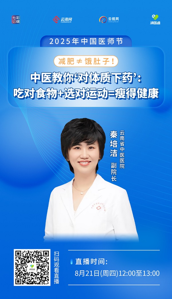 什么是中医体质?常见的与肥胖相关的体质有哪些?不同体质的肥胖有什么典型表现?针灸、推拿、艾灸等中医外治法对减肥的作用机制是否安全有效?8月21日12:00至13:00,云南省中医医院内分泌科秦培洁副院长做客滇医通直播间,欢迎扫码观看。