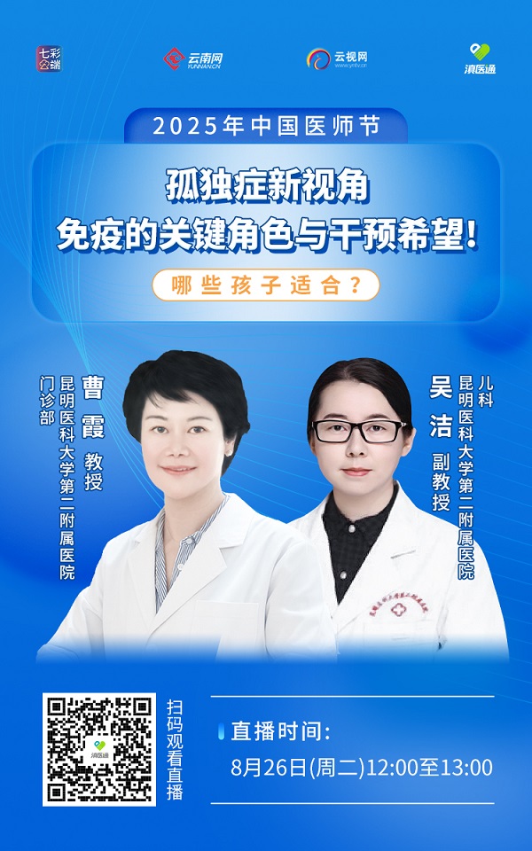什么是孤独症?为何被称为来自“星星”的孩子?孤独症孩子有哪些容易被家长忽略的信号?哪些因素可能导致孤独症?目前全世界范围内对孤独症的免疫治疗有哪些?8月26日12:00至13:00,昆明医科大学第二附属医院门诊部主任曹霞教授及团队做客滇医通直播间,欢迎扫码观看。