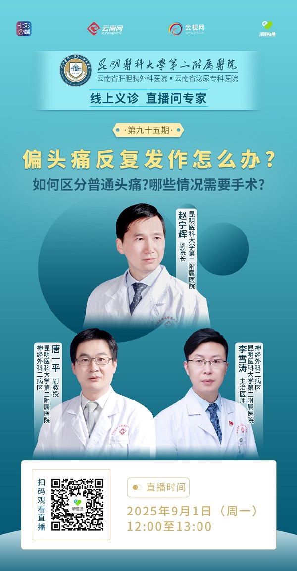 偏头痛的“典型症状”有哪些?如何诊断不同类型的头痛?偏头痛、紧张性头痛、三叉神经痛有何区别?偏头痛的常见诱因是什么?什么样的偏头痛患者需要进行手术治疗?9月1日12:00至13:00,昆明医科大学第二附属医院赵宁辉副院长及团队做客滇医通直播间,欢迎扫码观看。