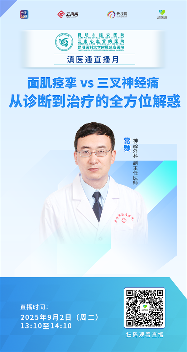 面肌痉挛和三叉神经痛最主要的区别是什么?目前有哪些治疗方法?什么时候需要做显微血管减压手术?日常生活中,哪些因素会诱发或加重病情?2025年9月2日13:10至14:10,专家做客滇医通直播间,欢迎扫码观看。