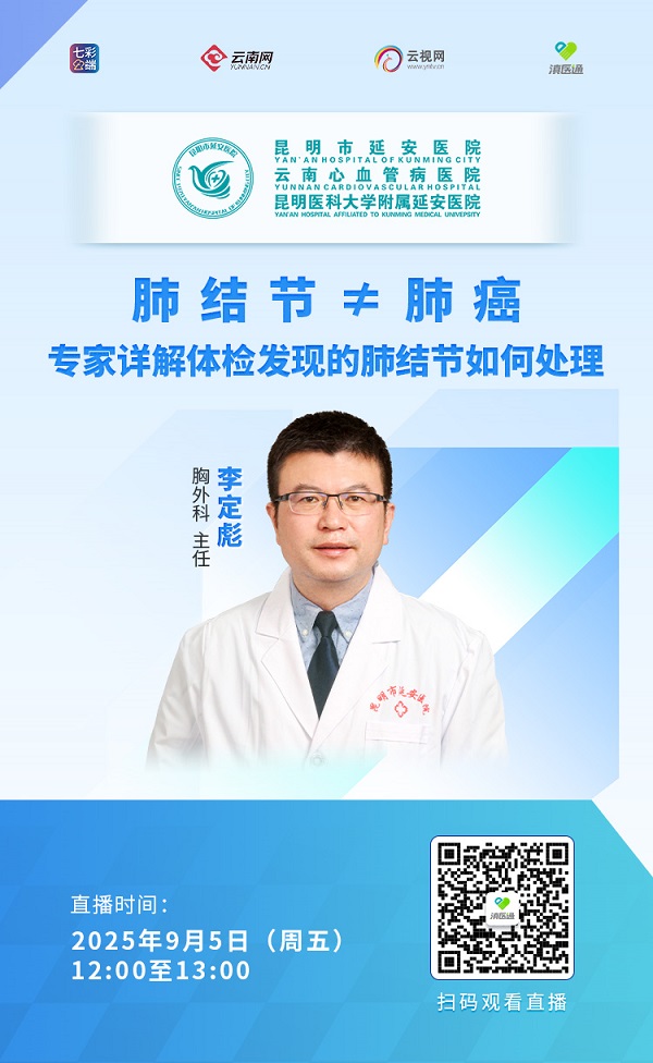 体检发现肺结节,是否等于肺癌?哪些人群是肺结节的高风险人群?肺结节的大小、形态(如磨玻璃、实性)如何判断恶性概率?CT报告上的“微小结节”“钙化灶”等术语是什么意思?CT、PET-CT或穿刺活检在什么情况下建议做?9月5日12:00至13:00,昆明市延安医院胸外科李定彪主任做客滇医通直播间,欢迎扫码观看。