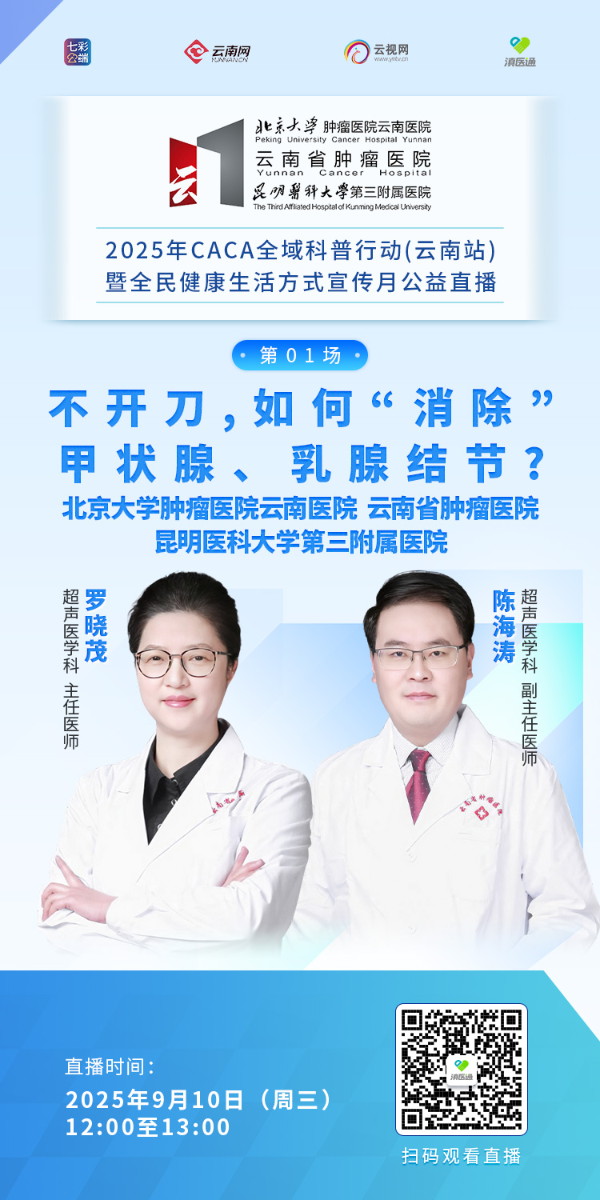 如今,体检发现甲状腺或乳腺结节很常见,它们到底是什么,对我们的身体有哪些影响?不开刀,如何“消除”甲状腺、乳腺结节?9月10日12:00至13:00,专家做客滇医通直播间为你解答。