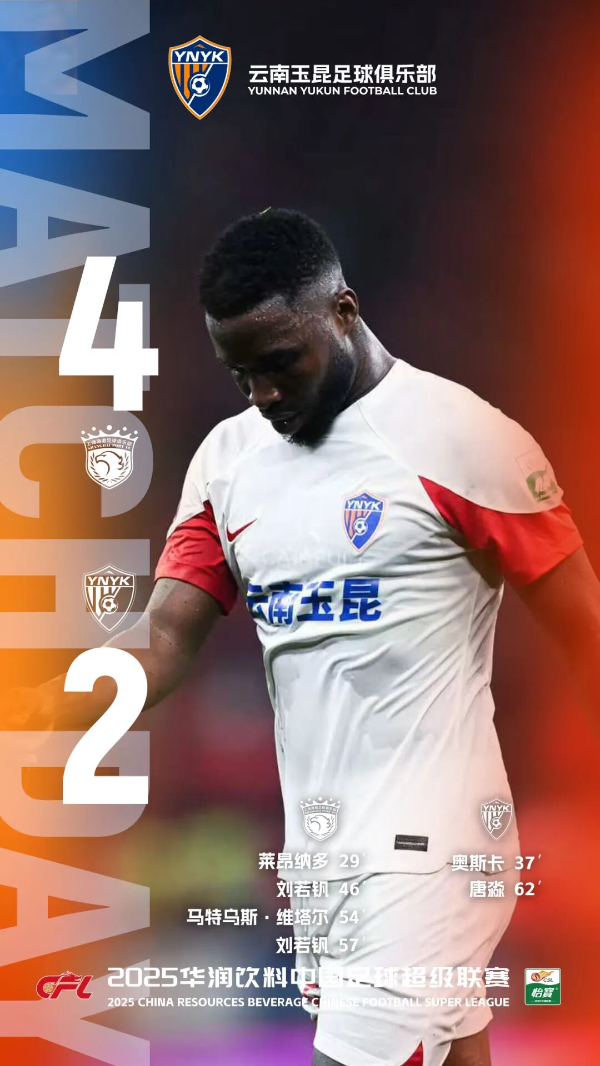 9月12日,中超联赛第24轮,升班马云南玉昆客场挑战上届联赛冠军上海海港的比赛率先开踢。此役坐镇主场的海港尽显卫冕冠军实力,全场狂轰29脚射门射正11次,创造出多达9次得分机会,最终凭借高效进攻斩获4粒进球。云南玉昆虽全力周旋却难改败局,最终海港主场4:2战胜玉昆,全取三分的同时也实现了本赛季对玉昆的主客场双杀。