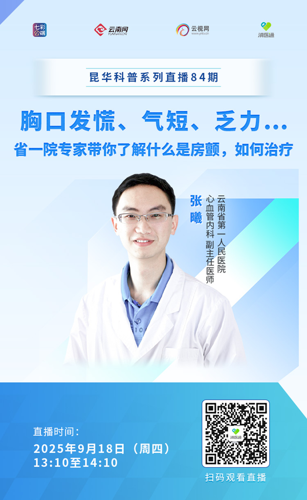 在生活中,很多人对房颤的了解并不多,甚至患病了也不知道。胸口发慌气短、乏力、心悸……身体出现这些症状,你可能是“房颤”了!2025年9月18日(周四)13:10至14:10,省一院专家走进直播间,带你了解什么是房颤,如何治疗。