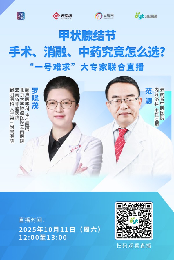 甲状腺结节超声报告上哪些词提示恶性风险?是不是所有恶性结节都必须外科手术?哪些明确的“指标”会建议手术?10月11日(周六)12:00至13:00,专家做客滇医通直播间为您解答,欢迎扫码观看。