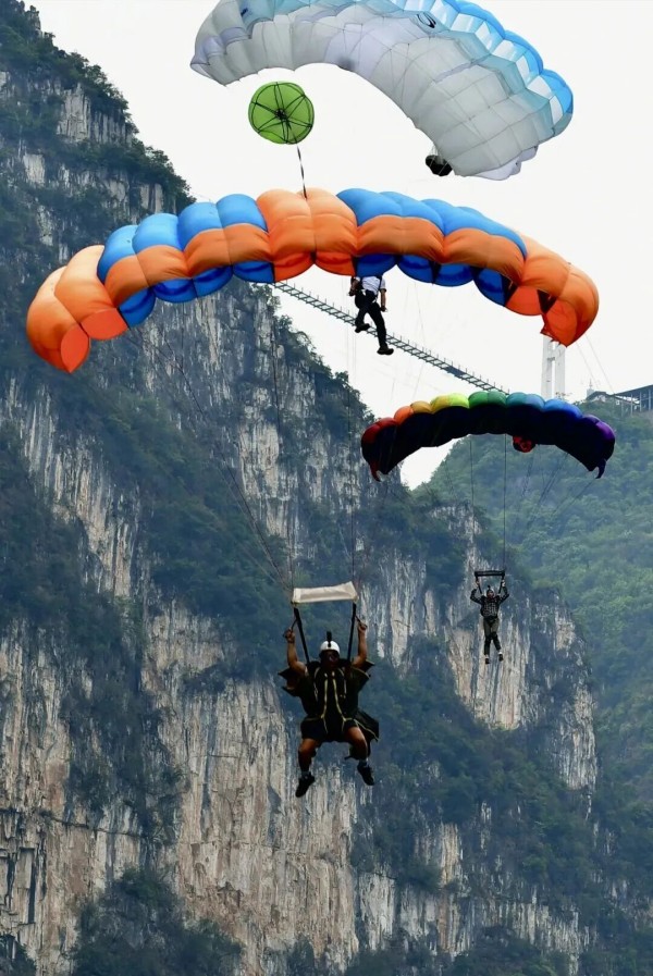 云巅之上,勇者得以拥抱苍穹。宣威尼珠河大峡谷,作为世界闻名的高空跳伞胜地,凭借天然优势成为极限运动的绝佳舞台。峡谷内独特的地形地貌、高耸的悬崖、深邃的谷底和壮观的河流,以及四个“世界之最”的设施更是为跳伞表演增添无与伦比的视觉冲击。2025年4月29日至5月5日,尼珠河大峡谷第二届高空跳伞表演火热举行。来自英国、法国、澳大利亚等17个国家的29名顶尖“空中飞人”齐聚于此,以一场震撼人心的“云端之舞”让现场游客大饱眼福。