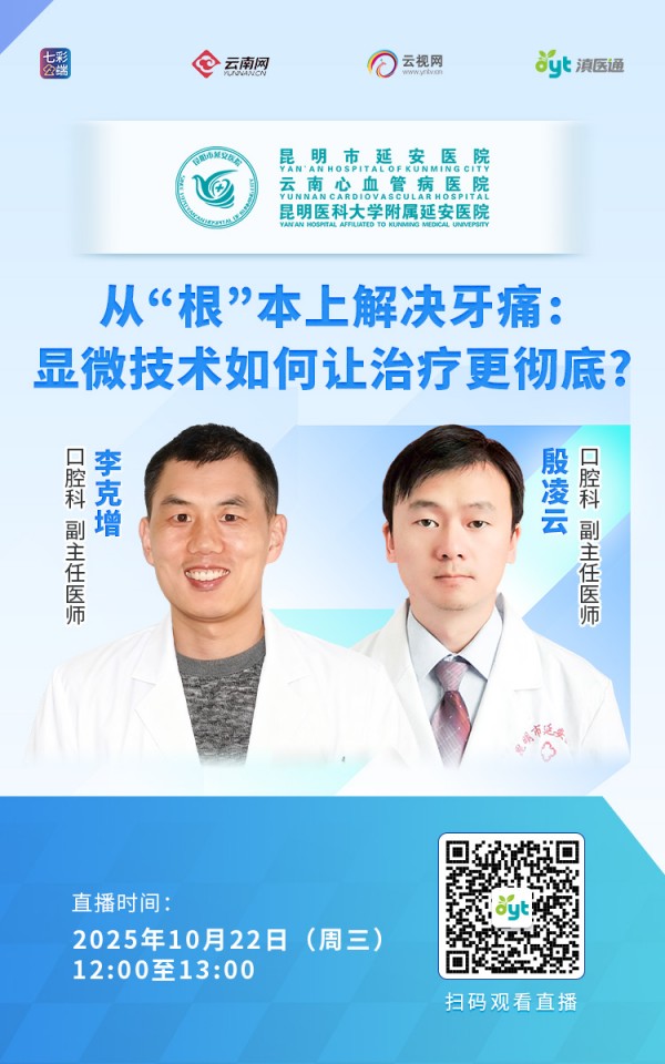 什么是显微根管治疗?和传统的根管治疗有什么区别?它最大的优势是什么?做完显微根管治疗,这颗牙是不是就“一劳永逸”了?它最终的寿命能维持多久?10月22日(周三)12:00至13:00,专家做客滇医通直播间为您解答,欢迎扫码观看。