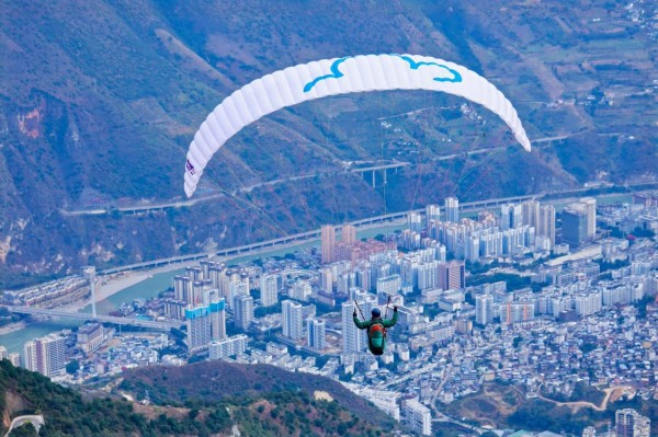 游客在怒江傈僳族自治州体验滑翔伞。