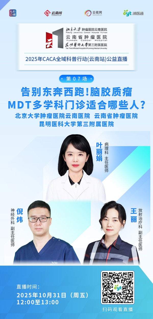 什么是脑胶质瘤多学科诊疗(MDT)?是挂一个MDT号,所有专家都能看吗?它和传统“一个医生看诊”相比有何区别?优势在哪里?脑胶质瘤MDT门诊具体是怎么运作的?10月31日(周五)12:00至13:00,专家做客滇医通直播间为您解答,欢迎扫码观看。