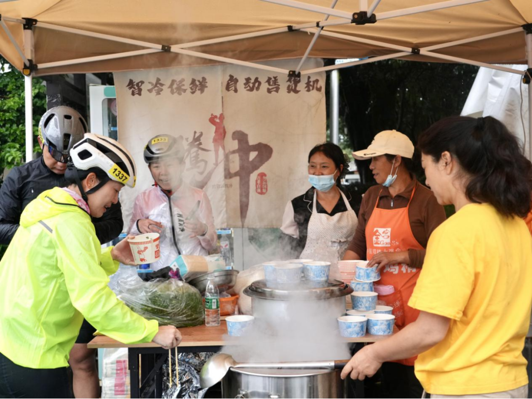 今年,腾冲站将节赛体验再次优化提升,不仅设置了“保山腾冲非物质文化遗产长廊”,展演腾越剪纸、皮影戏等非物质文化遗产,以及佤族歌舞快闪、民族服装旅拍等体验项目。考虑到天气突变原因,组委会早在开赛前一晚就做足了预案,不仅在赛事进程中及时结束了比赛,而且在赛事终点紧急设置多个热食点,免费提供土锅子、腾冲饵丝、大救驾、稀饭、姜汤等当地美食及热食,让选手们不仅体验了“舌尖上的腾冲”,更获得了冷雨中的一份难得的温暖。“腾冲的赛道真是又美又难,加上下雨,让今天的挑战难度急剧攀升,我也及时调整了自己的节奏,以免影响接下来的赛事。赛事的组织很完善,能够给我们提供及时的后勤保障,让我在雨中也能很安心地骑行,这趟骑行既有挑战又有温度。”刚到终点的选手沈国胜边喝着姜汤边描述着参赛感受。