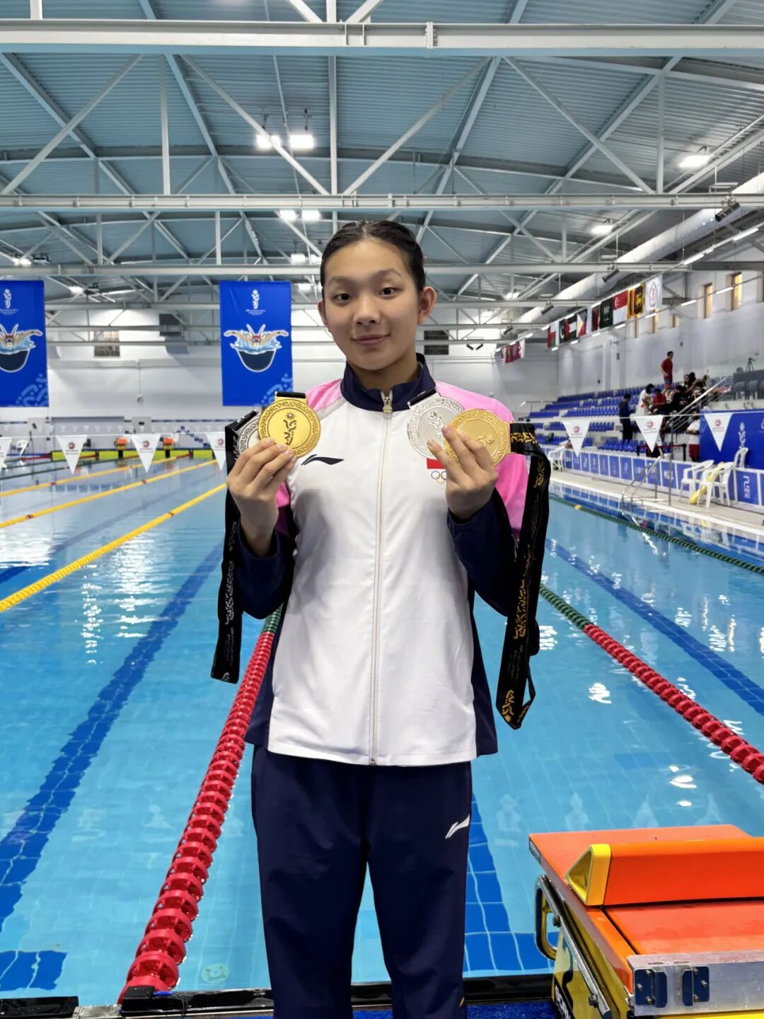 历经四天高强度赛事比拼,小将褚紫海凭借扎实的训练基础、稳定的竞技状态及顽强的拼搏精神,在参赛项目中均取得优异成绩:一举斩获女子4×100米混合泳接力、男女4×100米自由泳接力2枚金牌,女子200米自由泳、女子4×100米自由泳接力2枚银牌,女子100米自由泳项目获得第4名,实现“5项参赛、全部出彩”,为中国体育代表团争光,也为云南赢得了荣誉。