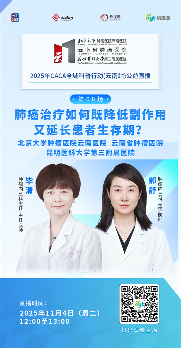 肺癌治疗如何既降低副作用又延长患者生存期?11月4日(周二)12:00至13:00,专家做客滇医通直播间为您解答,欢迎扫码观看。