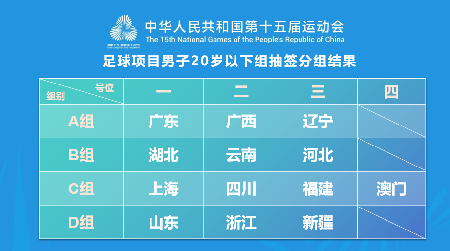 第十五届全国运动会U20男足决赛阶段比赛于11月1日开幕,13支参赛队伍分为4组进行3轮单循环赛,各小组第一名和第二名进入1至8名交叉赛并决出最终排名。云南队落位B组,在深圳市宝安体育中心体育场与湖北队、河北队展开较量。