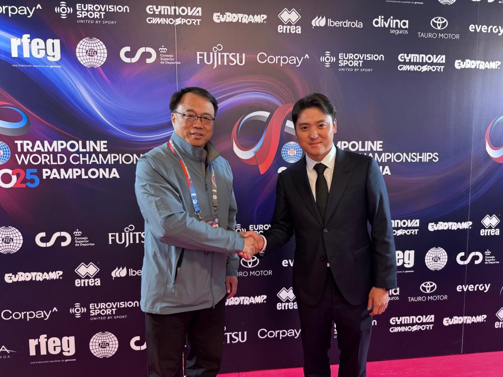 图为董栋(右)在西班牙参选现场。中国体操协会提供