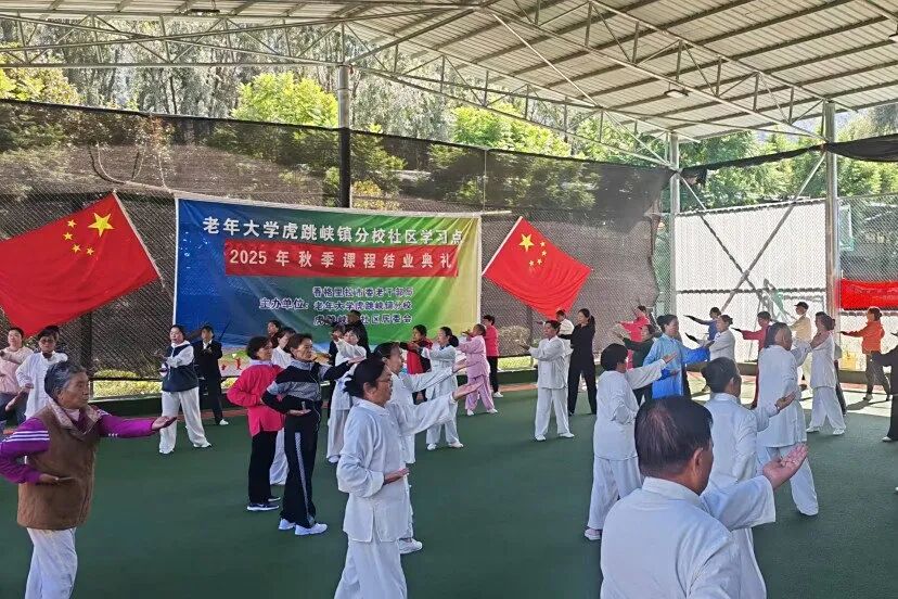 近日,2025年全国健身气功助力乡村振兴志愿服务暨百城千村交流展示活动——老年大学虎跳峡镇分校健身气功班在迪庆州产业园区门球场举行。虎跳峡镇、产业园区离退休人员和附近部分乡村老人共82人,全程接受为期10天的免费培训。