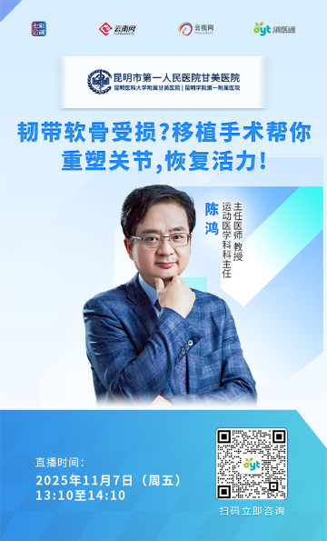 韧带和软骨分别有什么作用?损伤后身体会有哪些明显信号?哪些情况适合做移植?哪些可以通过保守治疗恢复?11月7日(周五)13:10至14:10,专家做客滇医通直播间为您解答,欢迎扫码观看。
