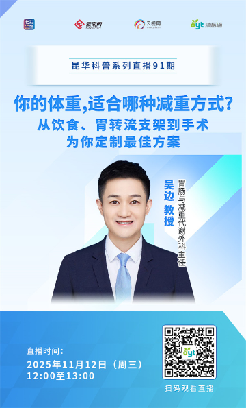流行的生酮、轻断食等减肥法,适合所有肥胖人群吗?有什么风险?什么样的肥胖才需要医疗干预?在什么情况下,建议患者考虑减重手术?减重手术的主要风险有哪些?如何规避?11月12日(周三)12:00至13:00,专家做客滇医通直播间为您解答,欢迎扫码观看。