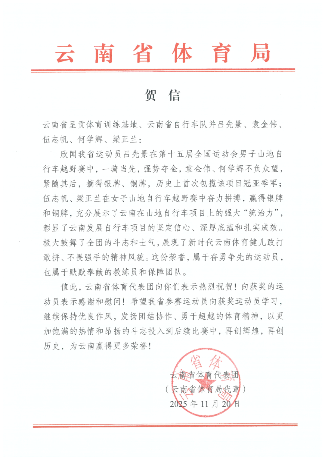 在第十五届全国运动会男、女子山地自行车越野赛中,云南运动员表现优异。吕先景在男子组比赛中一骑当先,强势夺得冠军;袁金伟与何学辉紧随其后,分获男子组银牌和铜牌。女子组方面,伍志帆勇夺银牌,梁正兰收获铜牌。云南省体育代表团向吕先景、袁金伟、伍志帆、何学辉、梁正兰等致贺信,全文如下: