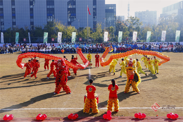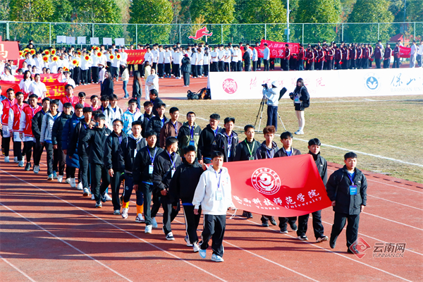 冬日的临沧,依然暖阳如织,绿意未减。开幕式上,各代表队精神抖擞、运动员朝气蓬勃。现场,进行升旗仪式和领导致辞后,滇西科技师范学院精心准备的《龙腾狮跃》《民族团结心连心》《体育为舟,强边有我》等精彩节目轮番上演,充分展现了临沧市丰富的民族文化底蕴和各族儿女团结奋进的精神风貌。最引人注目的是揭幕战开球仪式,一架无人机携带着联赛会旗、校旗和比赛用球,从云端缓缓降落至赛场中央,这一充满科技感的创新设计,展现了“以球会友、同心共融”的赛事宗旨,也象征着友谊与梦想的传递。