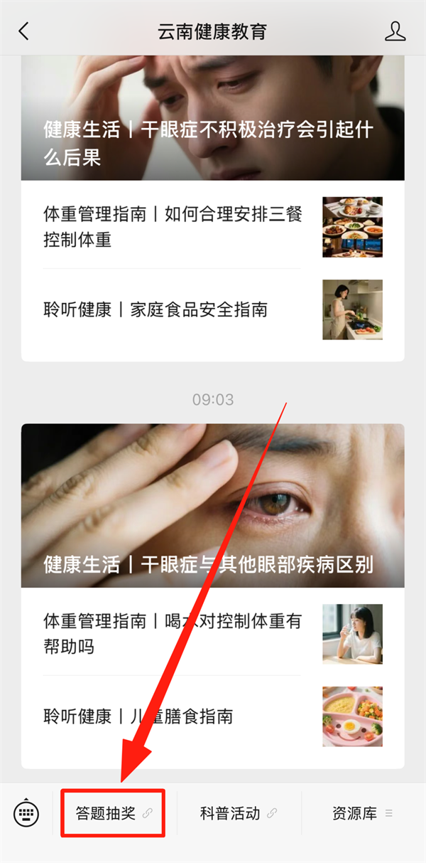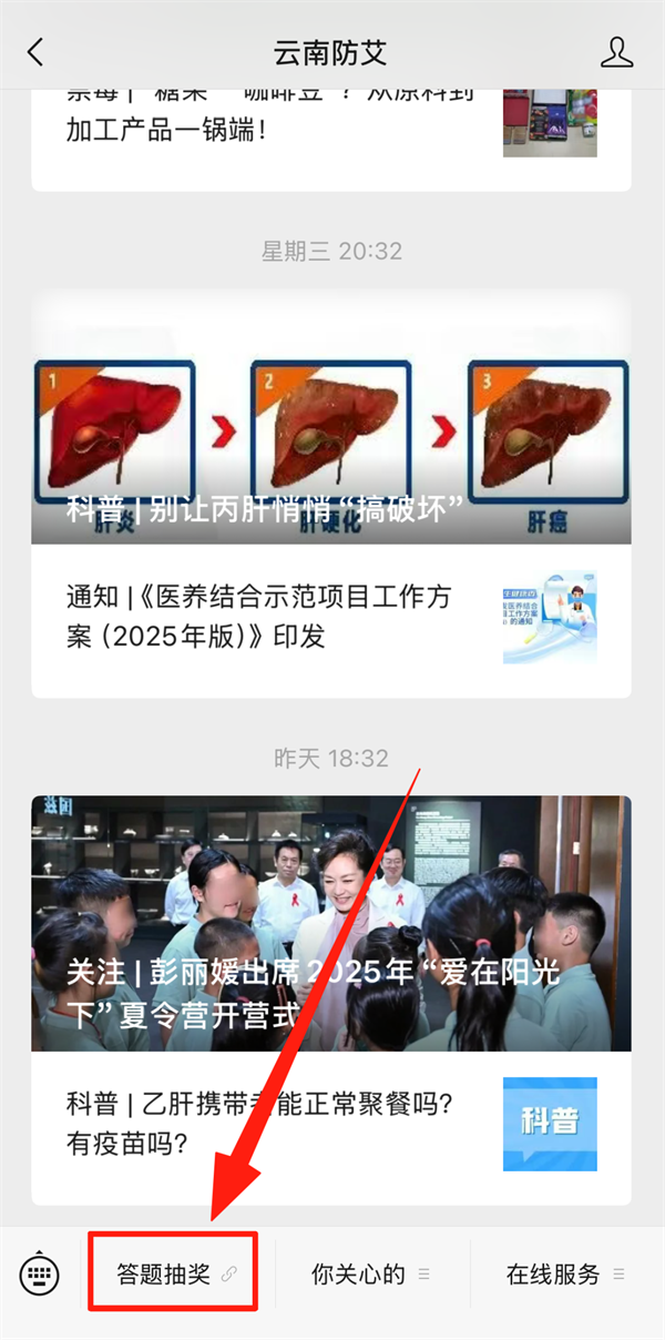 1.关注【云南防艾】【云南健康教育】微信公众号,点击底部菜单栏【答题抽奖】进入活动页面;