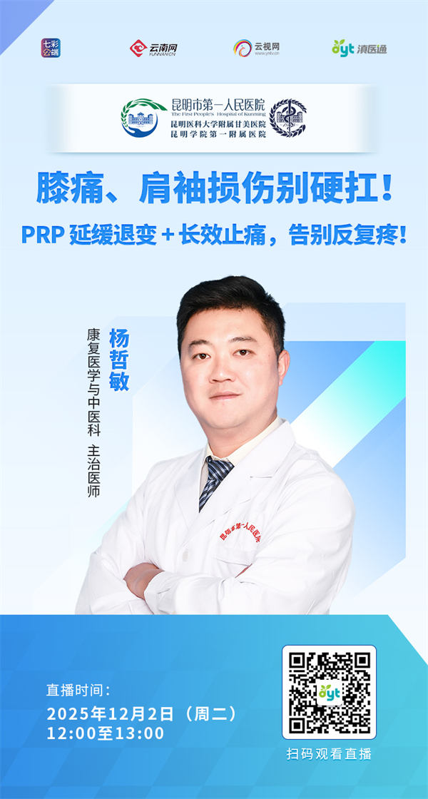 什么是自体血液修复术(PRP)?PRP治疗的核心原理是什么?和普通抽血有什么区别?膝关节炎、跟腱炎、肩袖损伤这些问题都能用PRP治疗吗?比起止痛药、针灸,PRP治疗的优势是什么?运动损伤后多久做PRP效果最好?注射后多久能重返运动?12月2日中午12点,昆明市第一人民医院康复医学与中医科杨哲敏专家做客直播间,欢迎扫码观看。