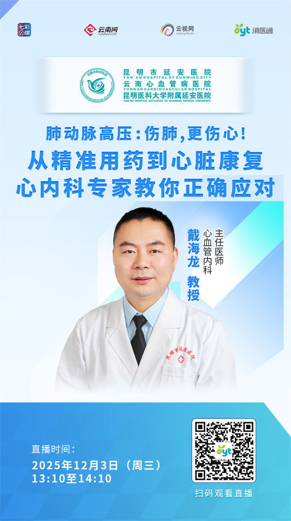肺动脉高压(PAH)是肺小动脉原发病变或其他原发疾病导致的肺动脉阻力增加,可表现为肺动脉压力升高而肺静脉压力正常。PAH的病因复杂、预后较差,尽早干预或可改善患者预后。12月3日13:10,心内科专家做客滇医通直播间为您答疑解惑。