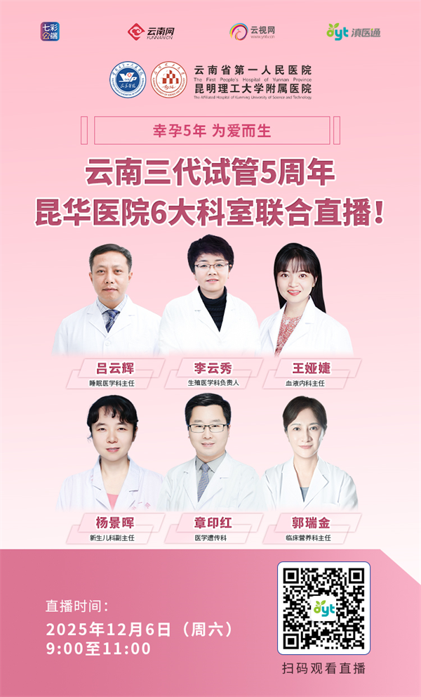 值云南三代试管技术应用5周年之际,12月6日上午9点,云南省第一人民医院(昆华医院)6大科室权威专家团齐聚,做客滇医通直播间,一站式解决你的生育难题!