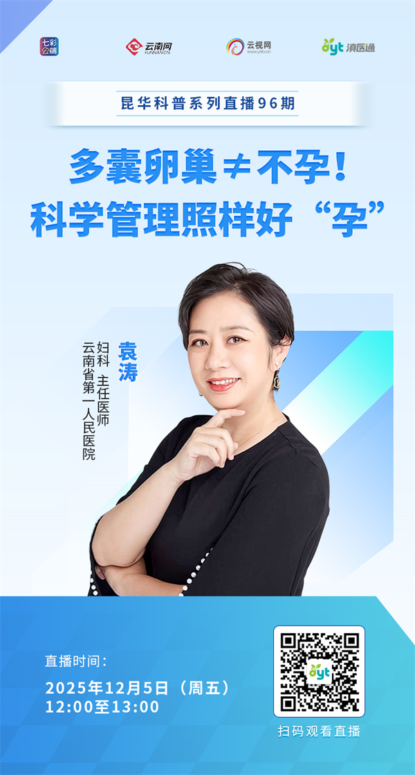 什么是多囊卵巢综合征?它只是一种妇科病吗?月经不规律,多久没来要警惕是多囊?不胖的女性,为什么也会得多囊?多囊一定会长痘、长胡子吗?得了多囊,是不是就怀不上孩子了?12月5日中午12点,云南省第一人民医院妇科袁涛主任做客直播间,欢迎收看!