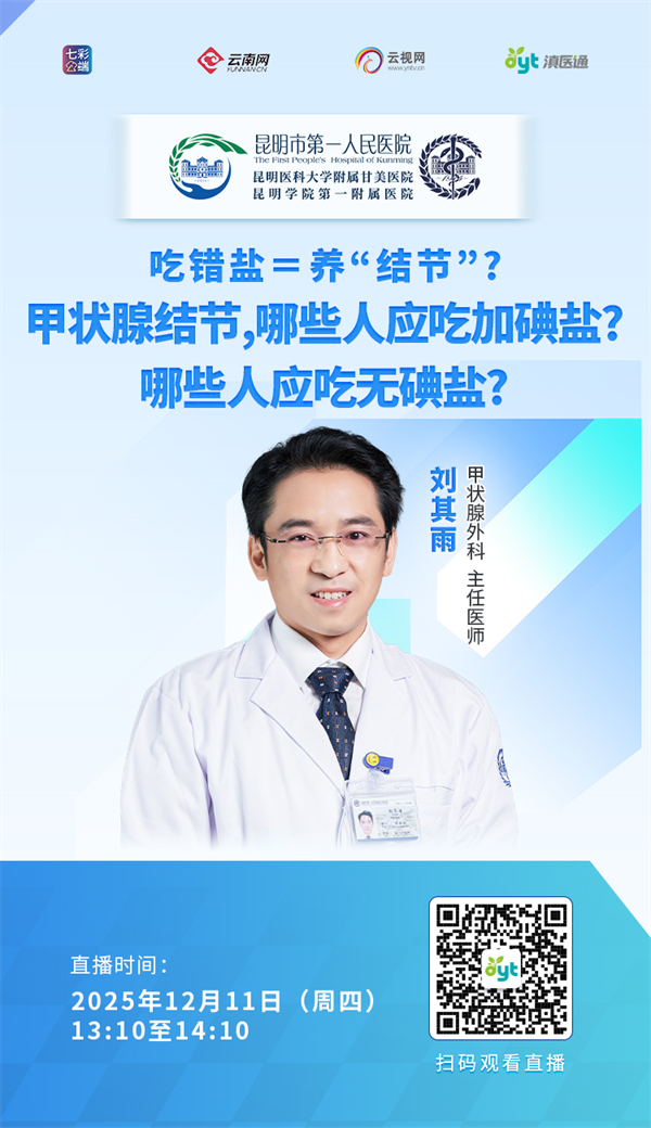 许多人将患结节等甲状腺疾病的矛头指向碘摄入过量,甚至跟风选择无碘盐。其实这是让碘盐背了黑锅。哪些人应吃加碘盐?哪些人应吃无碘盐?12月11日13:10至14:10,专家做客滇医通直播间,一起来看。