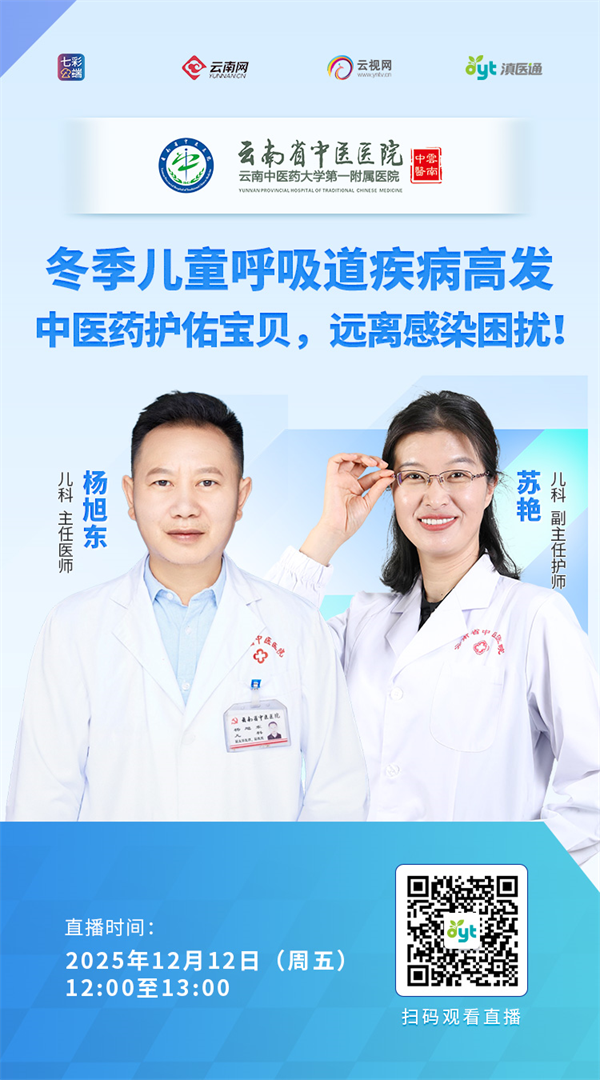 昆明秋冬干燥多风,为什么儿童更容易反复呼吸道感染?中医说的“肺常不足”和儿童秋冬呼吸道感染有关吗?如何通过中医药调理改善体质、减少复发?不同体质的孩子,秋冬中医防护方案有什么区别?孩子轻微咳嗽、流涕时,能先在家用中医药护理吗?哪些情况需要及时就医?12月12日中午12点,云南省中医医院儿科专家团队做客直播间,欢迎收看。