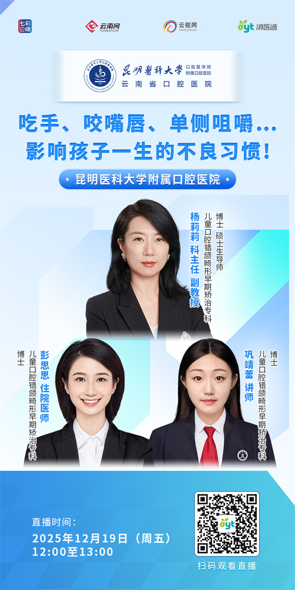 儿童时期是颌面部发育的关键阶段,不良口腔习惯会干扰正常的生长发育,导致各种错颌畸形。这些畸形不仅影响面容美观,更会影响咀嚼功能、发音清晰度,甚至导致呼吸问题。12月19日12:00至13:00,滇医通直播间,专家在线为您讲解。