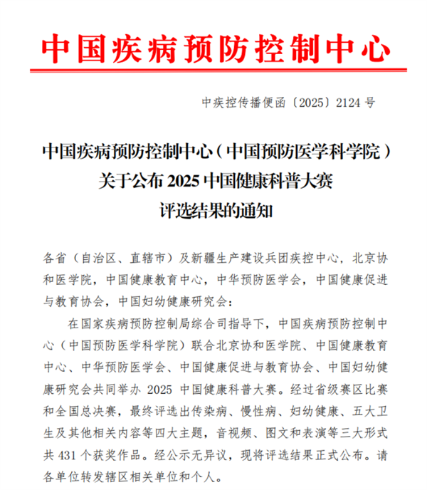 近日,在国家疾控局综合司指导下,中国疾控中心联合北京协和医学院、中国健康教育中心、中华预防医学会、中国健康促进与教育协会、中国妇幼健康研究会等共同举办的2025中国健康科普大赛全国总决赛圆满结束。大赛评选出涵盖传染病、慢性病、妇幼健康及五大卫生等四大主题,以及音视频、图文、表演等三大形式的431个获奖作品。其中,云南省参赛作品表现优异,有16部作品分获一、二、三等奖及优秀奖。