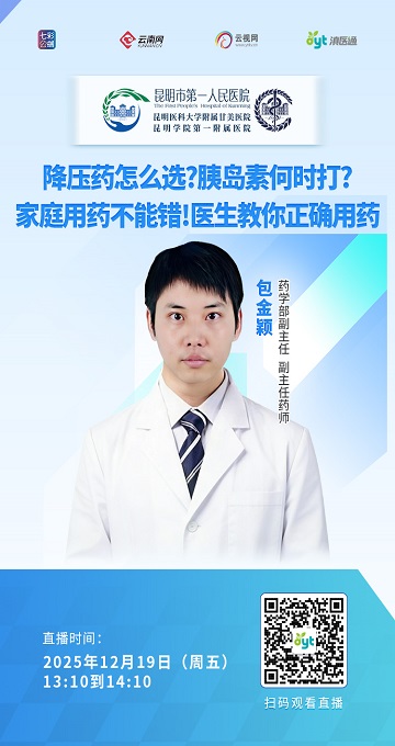 12月19日13:10-14:10,滇医通直播间特别邀请昆明市第一人民医院药学部副主任药师包金颖,为您带来一堂实用家庭用药指南课,解析常见慢病药物的正确使用时机、方法与禁忌,解答您最关心的用药困惑。