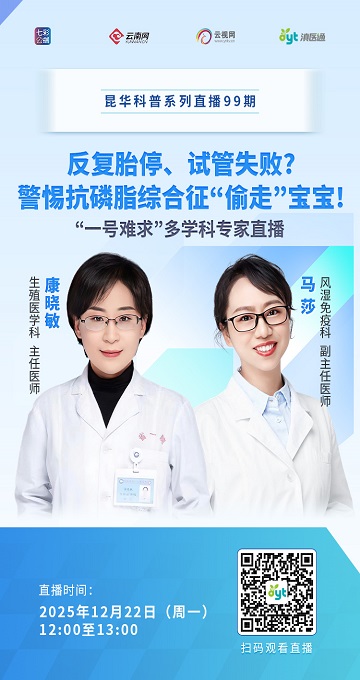 反复胎停流产早产找不到病因?试管婴儿总是未果?反复血管血栓形成、血小板减少?其实是一名“隐形杀手”抗磷脂综合征在“偷走”宝宝!12月22日12:00至13:00,来滇医通直播间,权威专家在线为您答疑解惑。