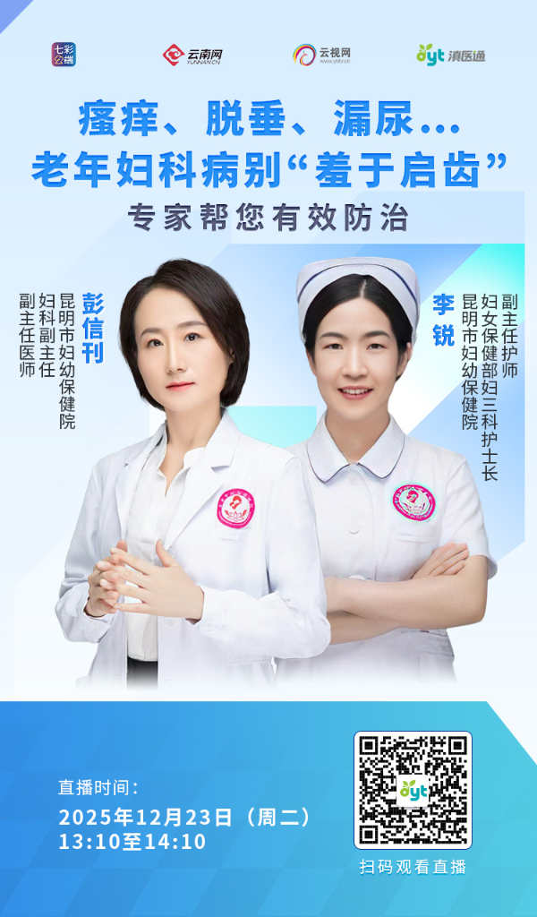 搔痒、有灼痛感、尿频、尿失禁……老年妇科病虽不危及生命,但让人痛苦不堪,且为难言之隐,严重危害老年妇女的身心健康。12月23日13:10至14:10,昆明市妇幼保健院专家做客滇医通直播间,欢迎收看。
