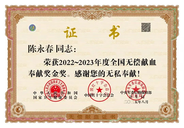 “13年间,累计无偿献血110次(全血16次,机采血小板94次),献血总量40600毫升,位居保山市无偿献血总量前五。”这是陈永春作为一名志愿者交出的闪光答卷。他也因此两次荣获由国家卫生健康委、中国红十字会总会、中央军委后勤保障部卫生局联合颁发的“无偿献血奉献奖金奖”。