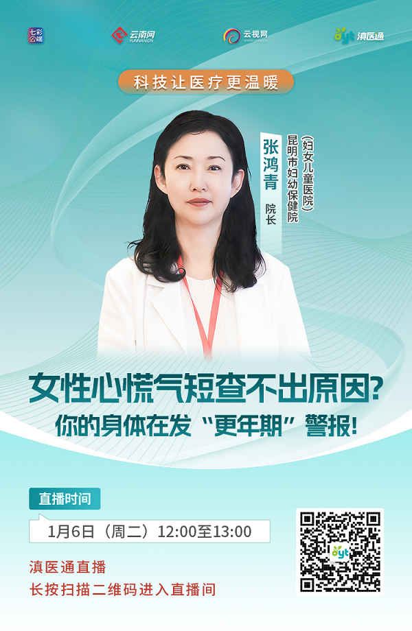 除了心慌气短,更年期还有哪些容易被忽略的“信号”?“更年期不是病,忍忍就过去了”,这种观念为什么是危险的?1月6日(周二)12点至13点,昆明市妇幼保健院院长张鸿青做客滇医通直播间为您解答。