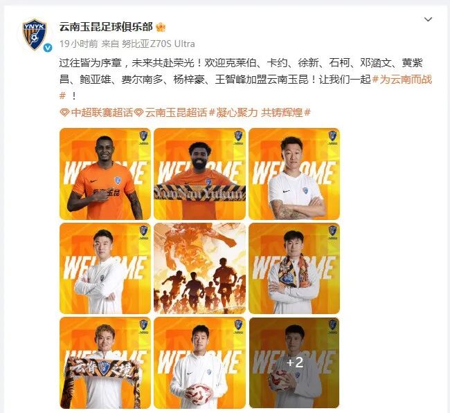 1月5日,云南玉昆足球俱乐部再发公告,一口气官宣10名新援加盟云南玉昆,其中包括2名外援和8名内援,分别是克莱伯、卡约、徐新、石柯、邓涵文、黄紫昌、鲍亚雄、费尔南多、杨梓豪、王智峰。