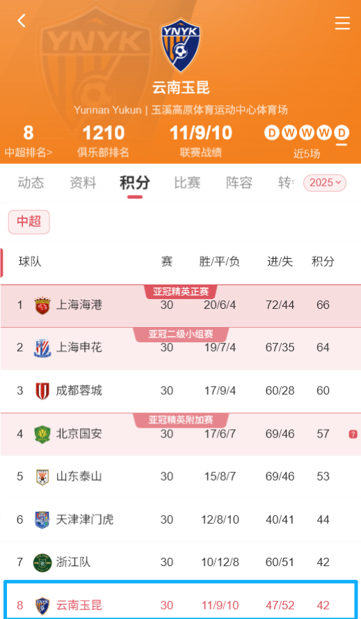 在2025赛季,首次出战中超的云南玉昆排名第8位;近年,云南首个中甲冠军、云南首支中超球队、足协杯4强(云南历史最佳成绩)等战绩加身。