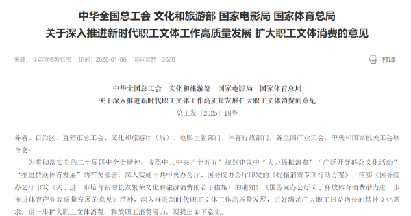 近日,中华全国总工会、文化和旅游部、国家电影局、国家体育总局联合印发《关于深入推进新时代职工文体工作高质量发展 扩大职工文体消费的意见》(以下简称《意见》),旨在系统推进职工文体工作,释放消费潜力,满足广大职工日益增长的精神文化需求。