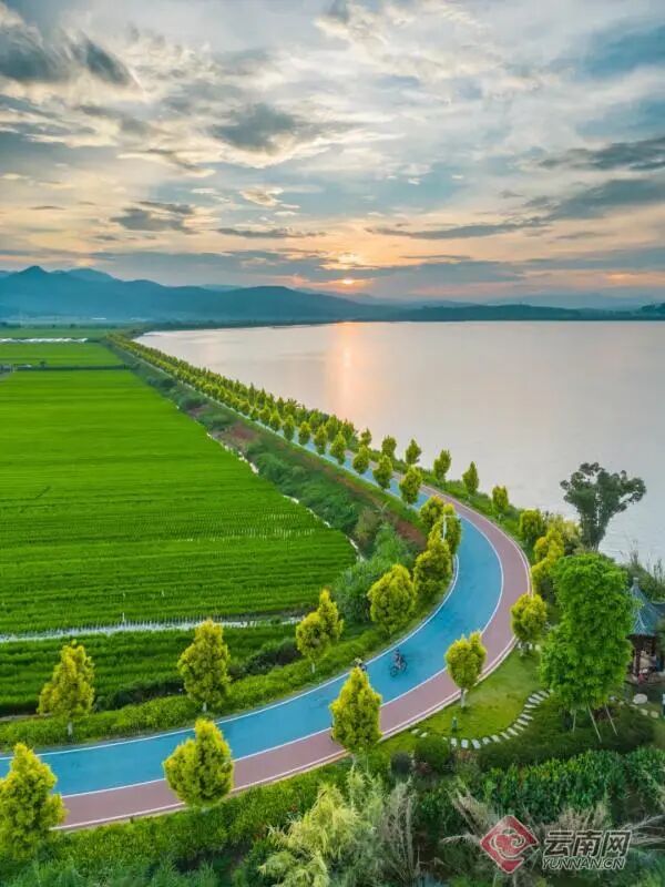 作为云南九大高原湖泊之一,异龙湖拥有97%湿地率的国家湿地公园生态基底,环湖廊道串联“湖—林—田—村”多元景观带,骑行途中可沉浸式体验三重景观维度——水域景观涵盖“三岛九曲七十二湾”的湖光涟漪,湿地景观可见白鹭、紫水鸡、黑翅长脚鹬等鸟类,目前已累计监测记录野生鸟类176种,含国家一级保护鸟类3种、二级保护鸟类20种;陆域景观随季节呈现木棉花、蓝花楹、荷花的次第绽放,其中南岸牛角咀的神黄豆花海与西岸的稻田碧浪构成特色田园画卷;廊道采用透水混凝土工艺打造红蓝双色赛道,既保障骑行安全,又实现雨水自然渗透,与湖滨生态系统和谐共生。