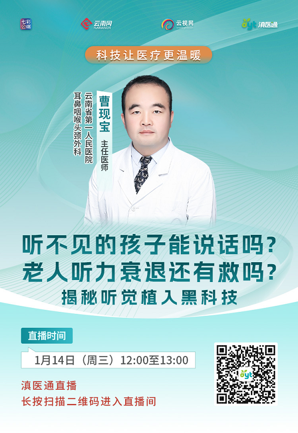 听觉植入和助听器,根本区别在哪里?除了大家熟知的人工耳蜗,还有哪些“听觉植入”技术?孩子刚出生就听不清,多大做植入比较好?老年人听力越来越差,戴助听器也没用,还有机会做植入吗?一只耳朵全聋,另一只正常,需要做听觉植入吗?1月14日中午12点至13点,云南省第一人民医院耳鼻咽喉头颈外科专家做客滇医通直播间为您解答。