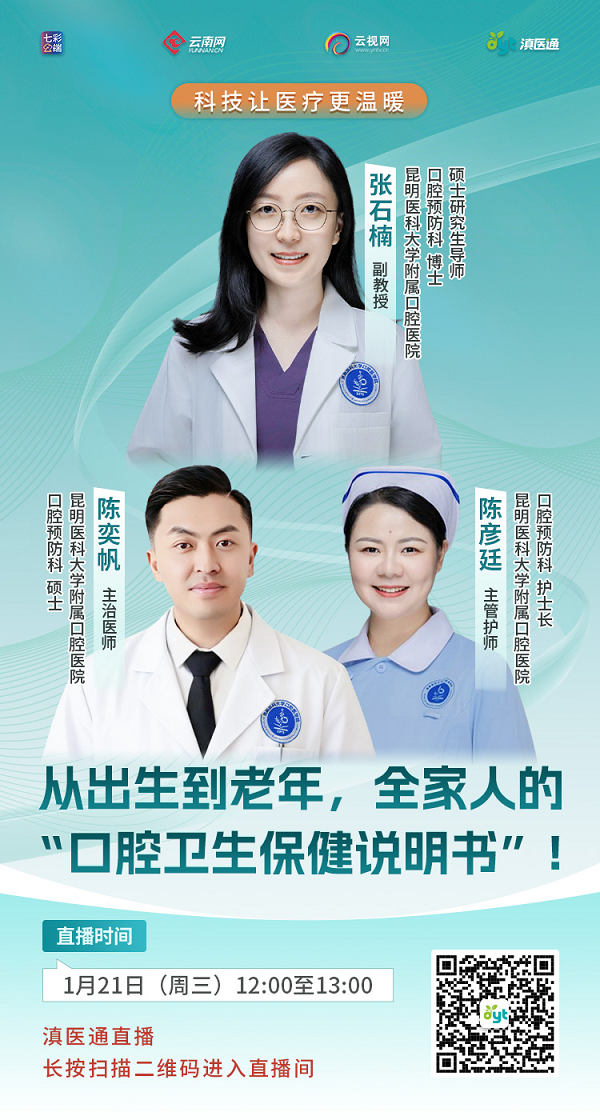 宝宝没长牙,需要口腔清洁吗?宝宝长第一颗牙,该怎么清洁?宝宝刷牙可以用电动牙刷吗?小学生及成年人最佳的刷牙方式是什么?矫牙时,刷牙需要注意什么?1月21日(周三)12点至13点,昆明医科大学附属口腔医院口腔预防科专家团队专家做客滇医通直播间,为您解答。