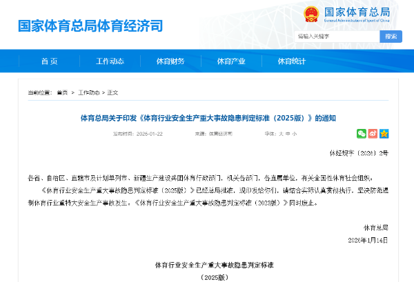 为主动适应体育事业高质量发展新形势,精准应对体育行业安全治理新挑战,结合行业实践与监管需求,国家体育总局修订发布《体育行业安全生产重大事故隐患判定标准(2025版)》(以下简称《2025版标准》)。《2025版标准》以《中华人民共和国安全生产法》《中华人民共和国体育法》等相关政策法规和体育领域相关标准规范为依据,进一步明确体育行政部门监管边界、责任清单与执法依据。