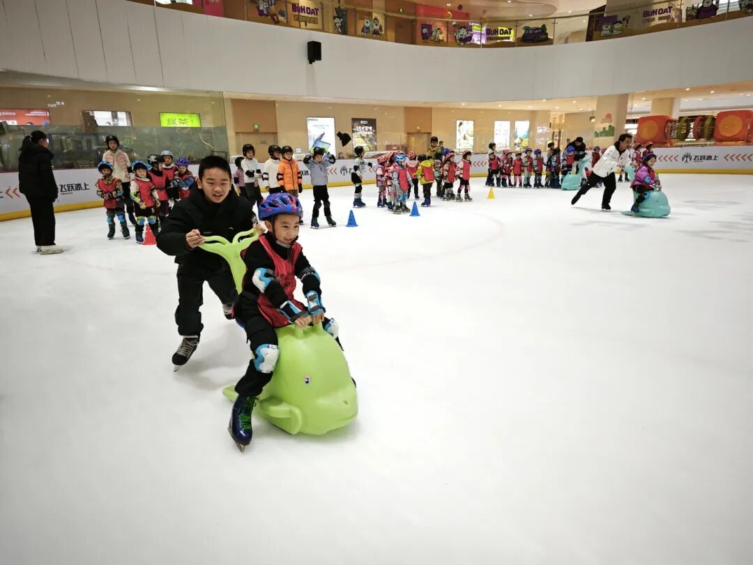 1月28日至29日,活动转场至昆明瑞鼎城飞跃冰上运动中心,开启滑冰体验篇章。教练团队依旧从基础抓起,细致讲解冰鞋与护具的穿戴要点,耐心指导大家扶栏站立、踏步、重心移动等动作,还安排了冰上助手辅助滑行,帮助初学者快速建立信心。待大家熟悉基础动作后,“冰上接力赛”“冰上拔河”等低难度集体游戏轮番上演,现场欢呼声、呐喊声此起彼伏。“和小伙伴一起在冰上比赛太有意思了,大家一起努力的感觉特别棒!”参与游戏的小朋友们都笑着说。