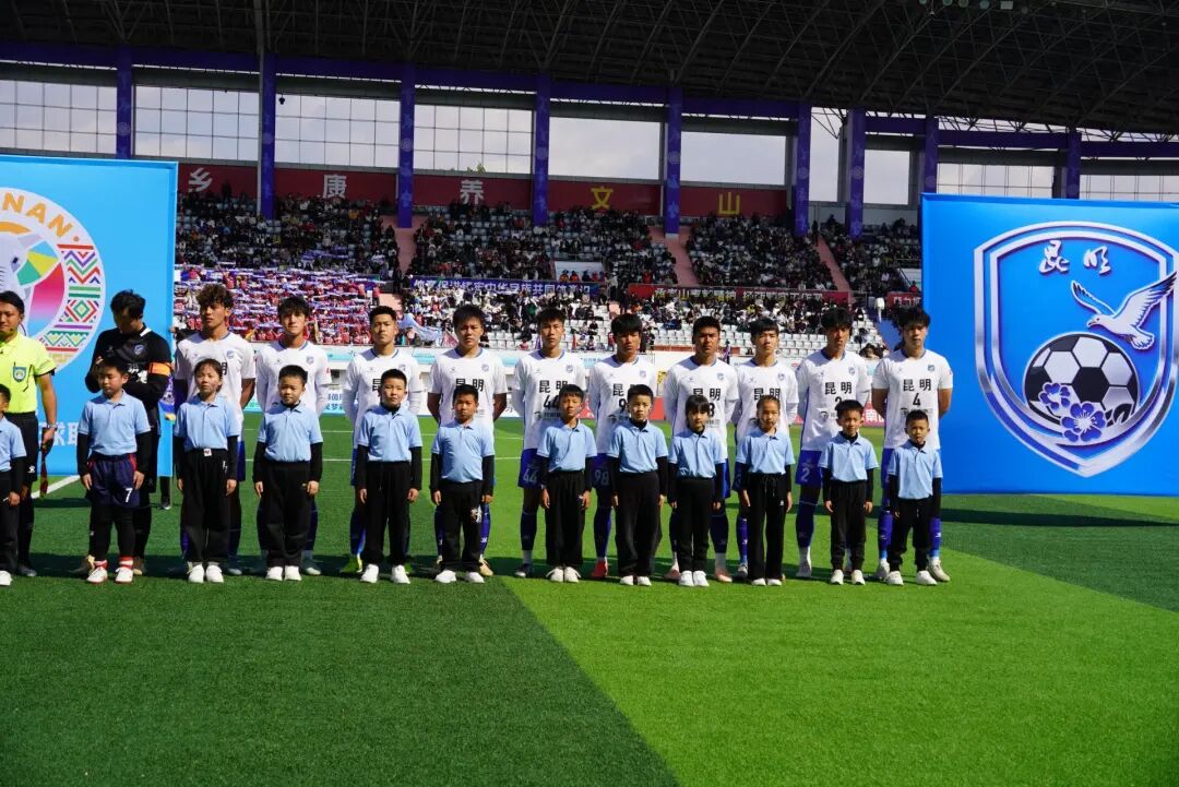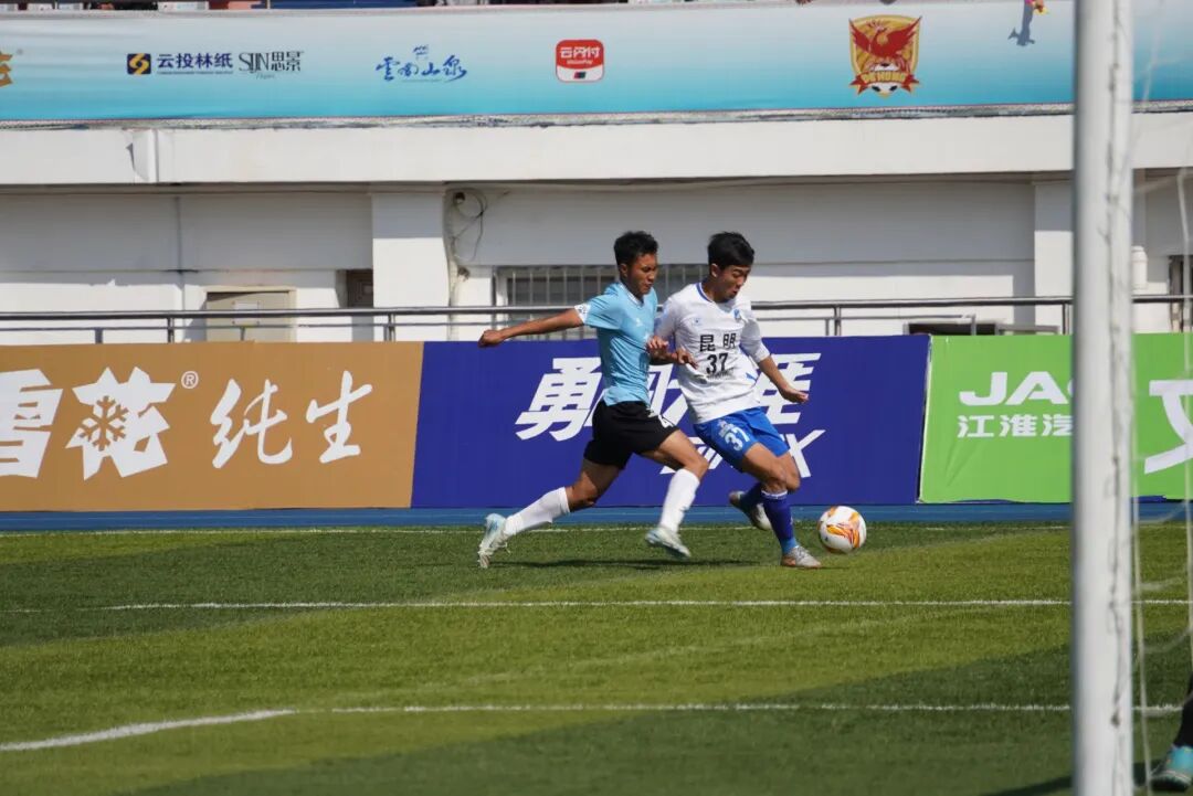 比赛的基调在开场仅三分钟便已奠定。昆明队从右路发动攻势,91号鲁宋扬一记精准的传中飞向文山队禁区,文山队门将接球时出现致命脱手,机敏埋伏在门前的昆明队37号小将洪皓如同猎豹般捕捉到战机,轻松推射空门得手。1比0!这粒进球不仅为昆明队打开了胜利之门,更刷新了球队本赛季最快进球纪录。
