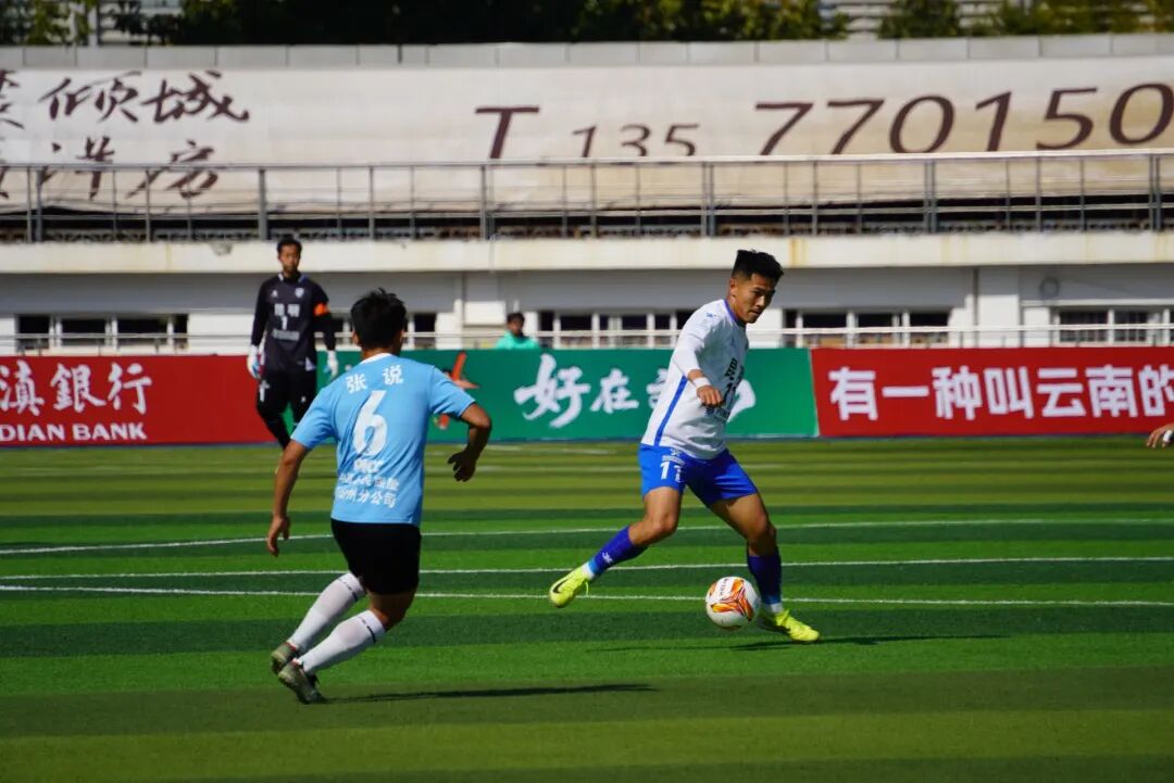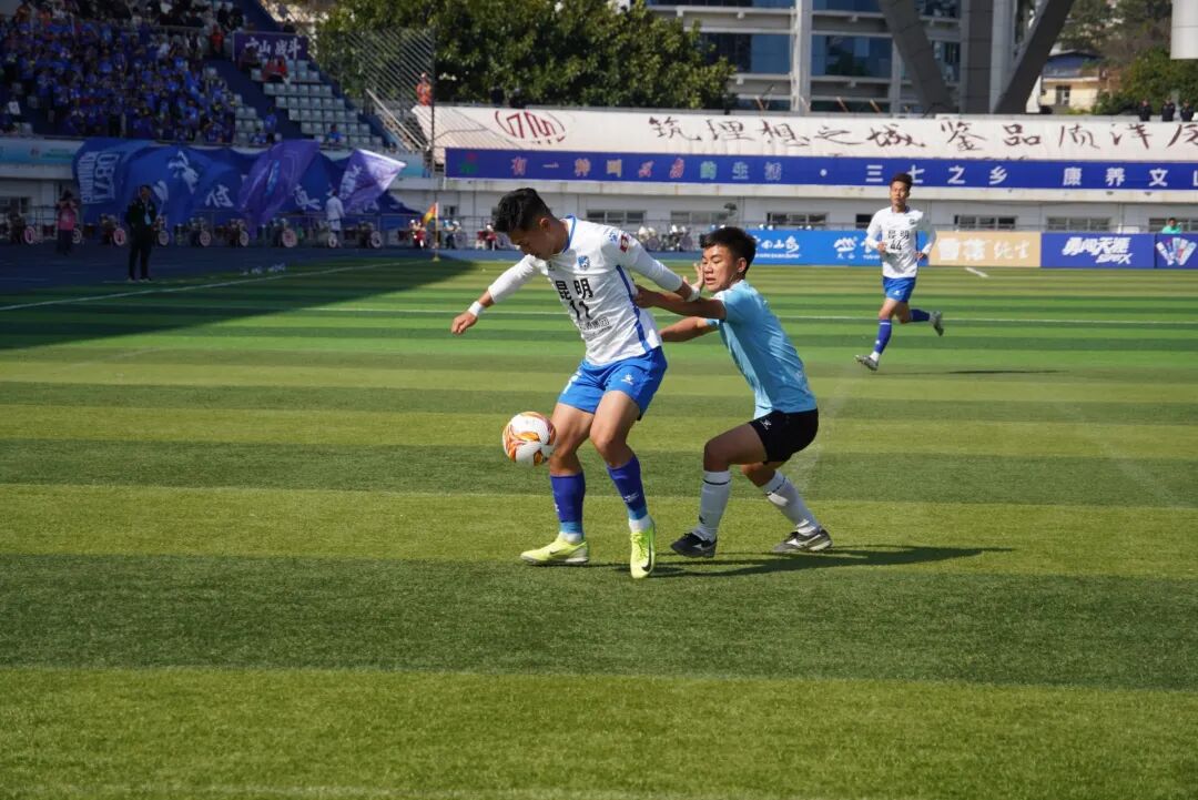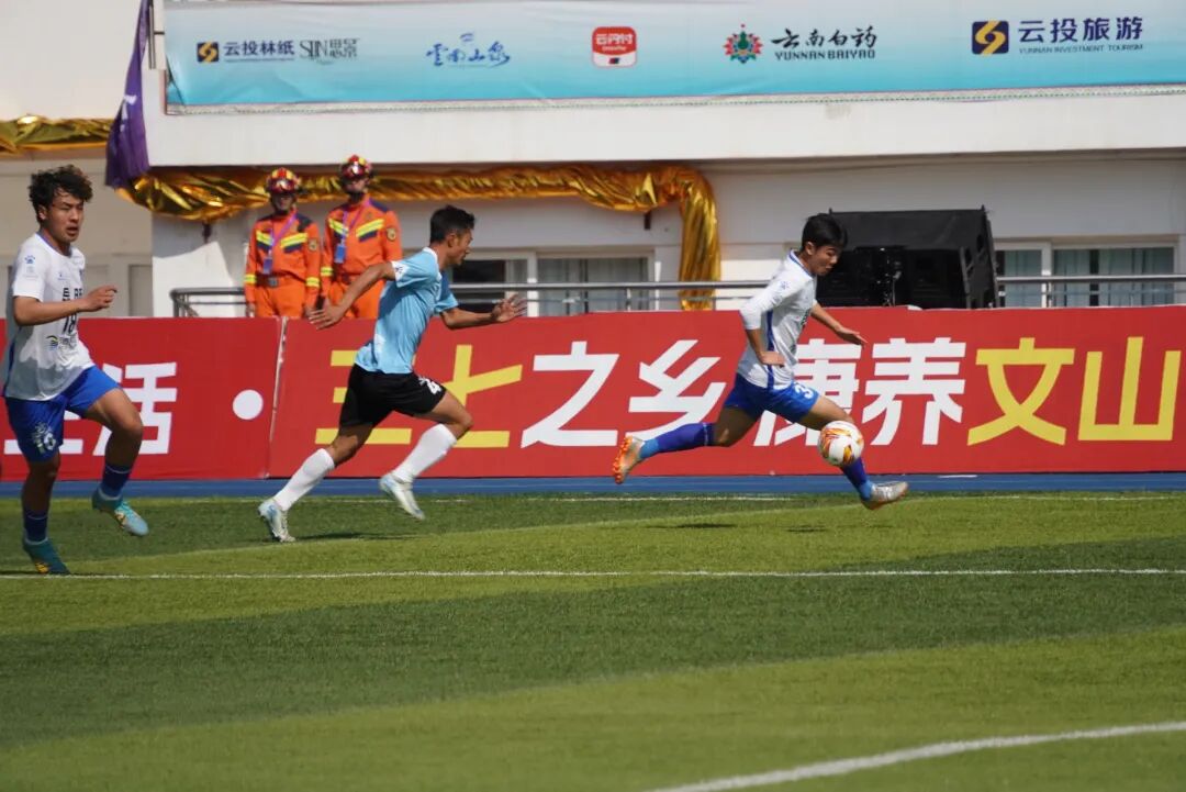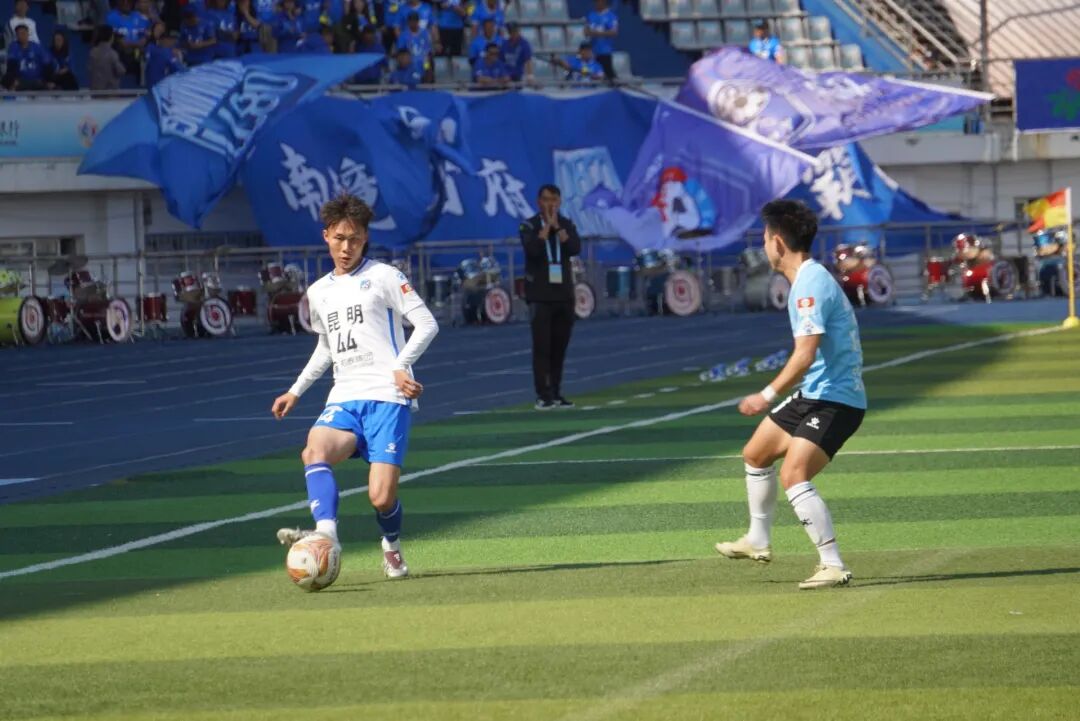 左边前卫,正是为球队首开纪录的洪皓。这位年仅16岁、还在上高二的小将,在比赛前一天刚刚结束学校的期末考试,便马不停蹄地乘坐高铁赶往文山与球队会合。舟车劳顿与学业压力并未影响他的状态,比赛中他延续了犀利的突破风格,是左路一把锐不可当的尖刀。右边前卫鲁宋扬则展现了截然不同的特点,他跑动积极,接应意识出众,传球时机与脚法拿捏得当,是球队由守转攻的重要枢纽。