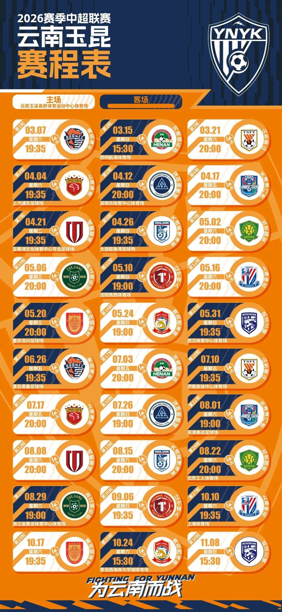 原标题:云南玉昆2026怡宝中超联赛赛程表