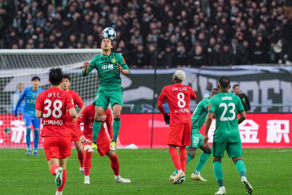 3月1日,北京国安队球员张玉宁(上)在比赛中争顶。新华社记者 李博 摄