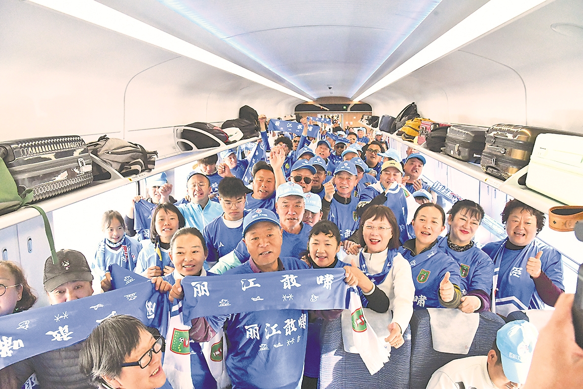 2月28日,前往玉溪的丽江球迷在动车上合影。(记者 赵庆祖 摄)
